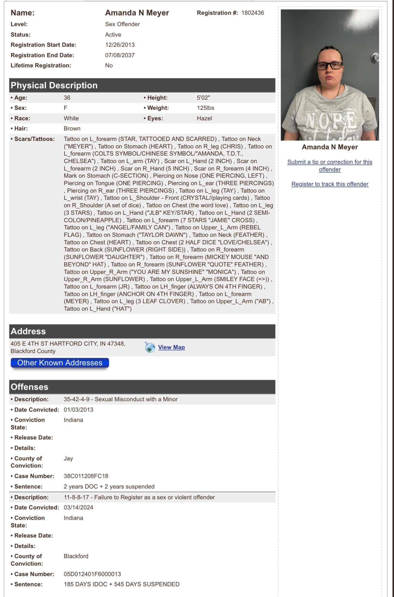 Indiana Sex OffendersAmanda Nicole Meyer | Blackford County | ๐จ Sexual Predator Alert ๐จ Hoosier MugsMar 21, 2026ShareCharges:35-42-4-9 - Sexual Misconduct with a Minor