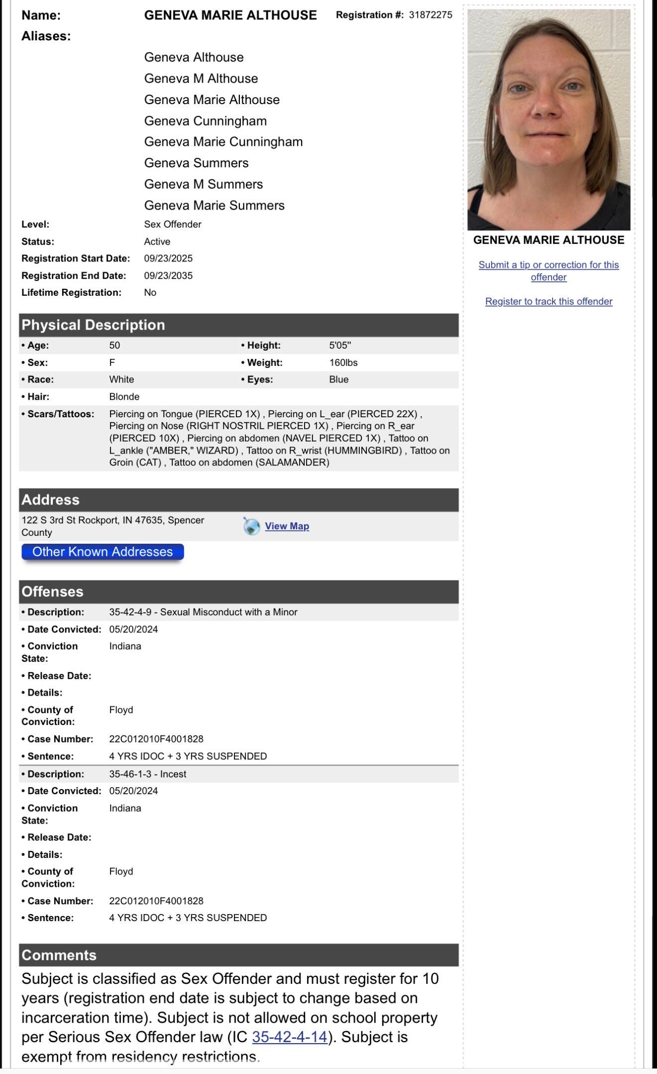 (State appears by Kristin Perdue, DPA; Defendant appears with counsel J. Bart McMahon; Sentencing Hearing held; Court takes notice of the Pre-Sentence Investigation Report filed with the Court on May 17, 2024; Court previously accepted the Defendant’s guilty plea and Plea Agreement; The Court finds the Defendant’s guilty of Count 1, Sexual Misconduct with a minor as a Level 4 Felony and Count 2, Incest as a Level 4 Felony; Judgement of Conviction is entered against her; Fees: Court Costs: Court Costs: Waived, PD Fee: $250.00, Child Abuse Prevention Fee: $100.00, APUF: $100.00, IPUF: $100.00, Monthly Fee: $30.00.)
