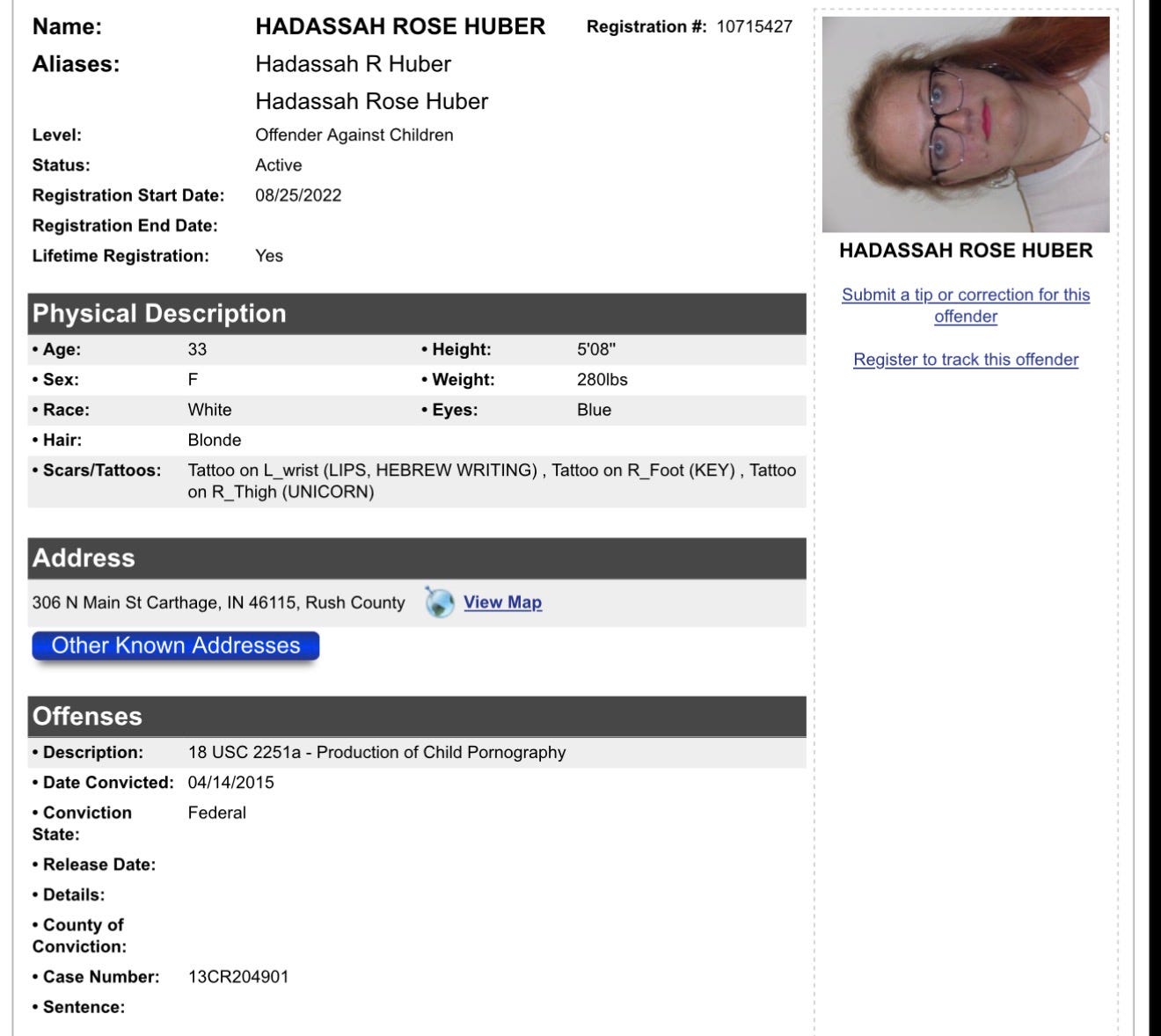 Indiana Sex OffendersHadassah Rose Huber | Rush County | ๐จ Sexual Predator Alert ๐จ Hoosier MugsApr 04, 2026ShareCharges:Production of child pornography.