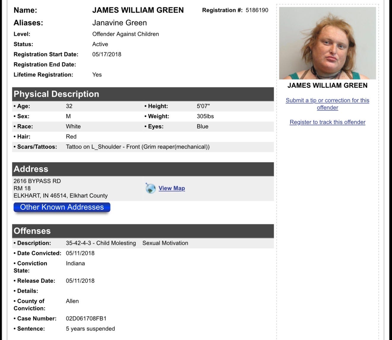 Indiana Sex OffendersJames William Green | Elkhart County | 🚨Sexual Predator Alert 🚨 Hoosier MugsApr 04, 2026ShareCharges35-42-4-3(a)/FB: Child Molesting, 35-42-4-3(b)/FC: Child Molesting