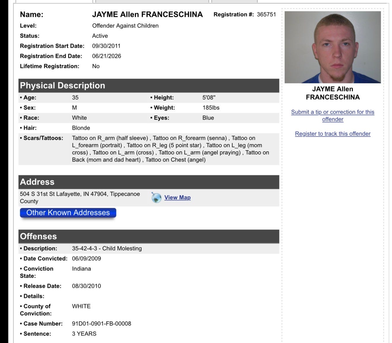 Indiana Sex OffendersJayme Allen Franceschina | Tippecanoe County | 🚨Sexual Predator Alert 🚨 Hoosier MugsApr 04, 2026ShareChargesCHILD MOLESTING- Fondling Or Touching With Child Under 14.