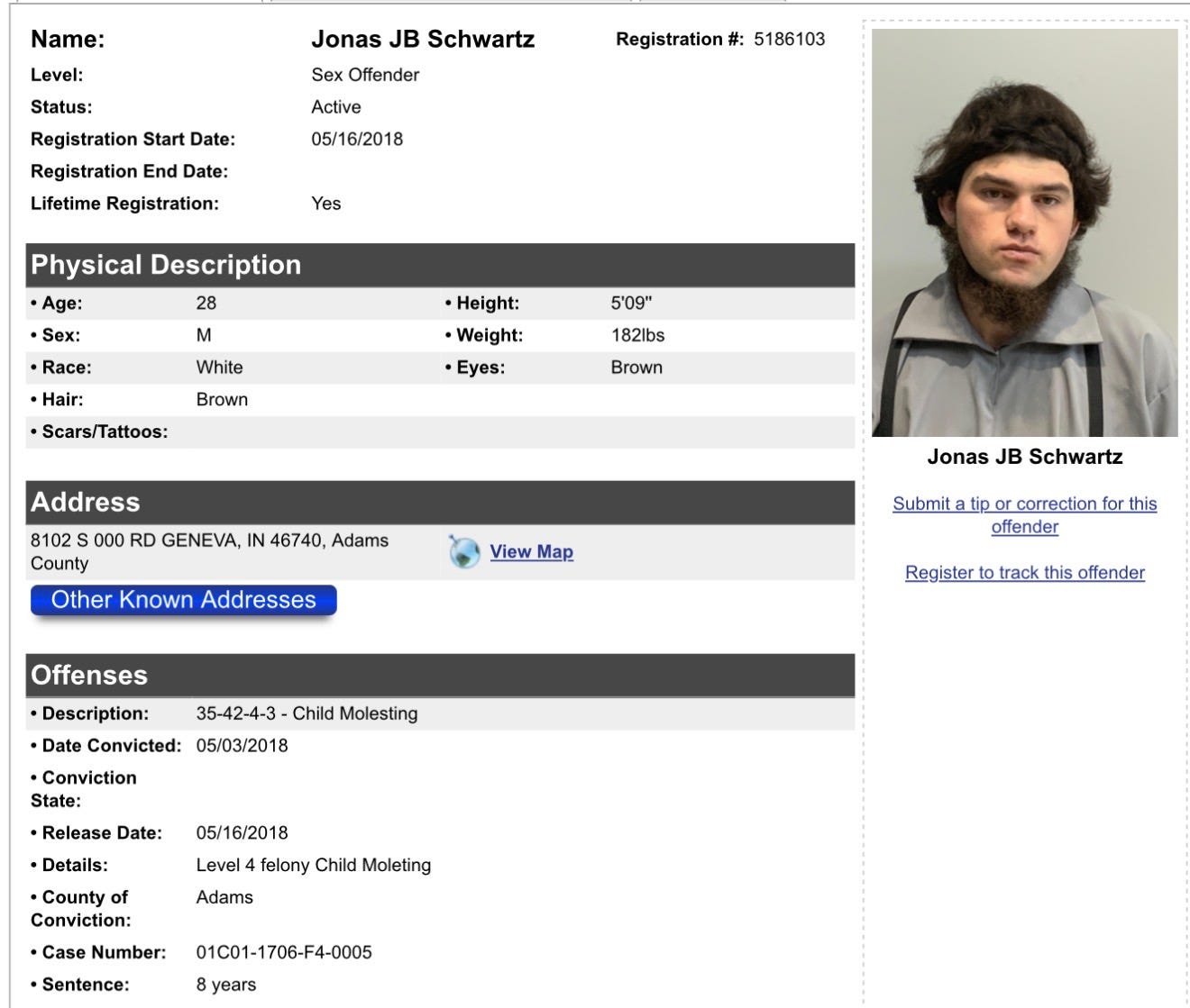 Indiana Sex OffendersJonas JB Schwartz | Adams County | 🚨Sexual Predator Alert 🚨 Hoosier MugsApr 04, 2026ShareCharges35-42-4-9(a)/F5:Sexual Misconduct with a Minor Def. has intercourse or engages in other sexual condu, CHILD MOLESTING- Fondling Or Touching With Child Under 14.
