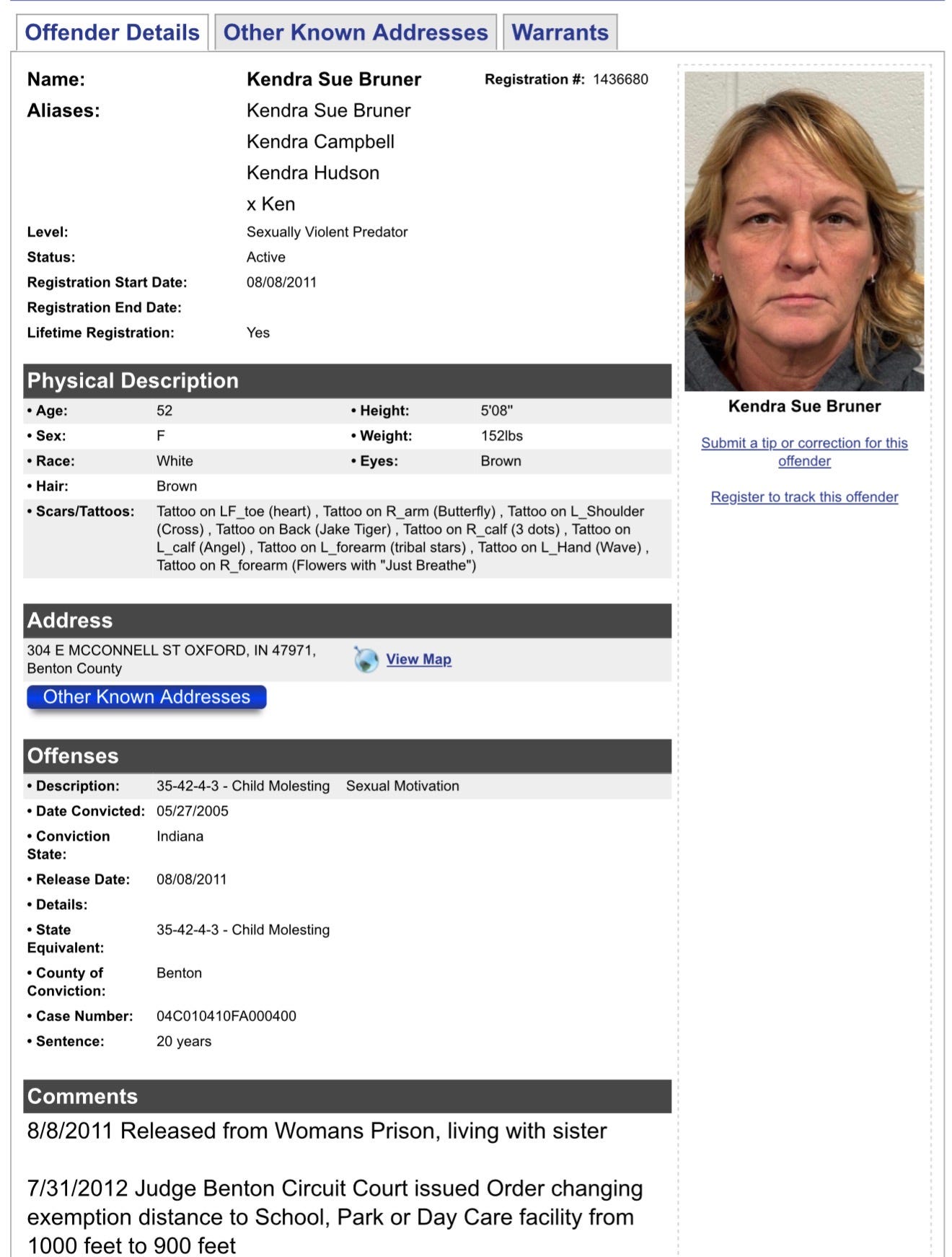 Indiana Sex OffendersKendra Sue Bruner | Benton County | 🚨Sexual Predator Alert 🚨 Hoosier MugsMar 15, 20261ShareCharges:35-42-4-3 - Child Molesting