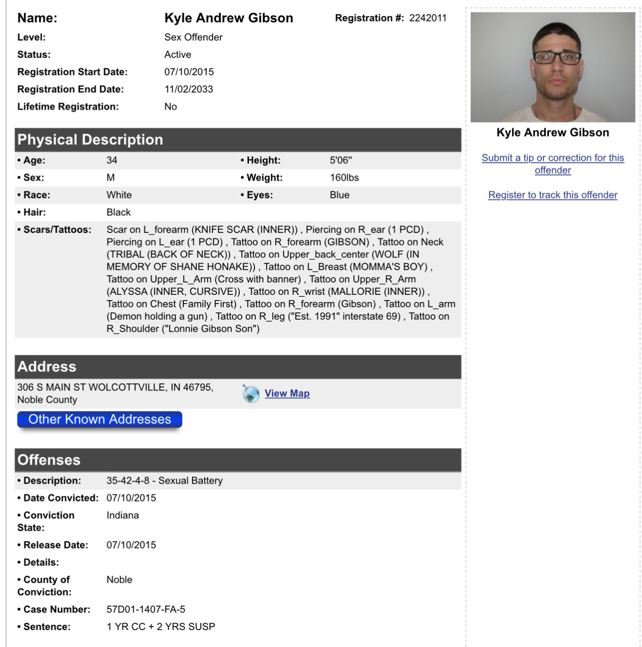Indiana Sex OffendersKyle Andrew Gibson | Noble County | 🚨Sexual Predator Alert 🚨 Hoosier MugsApr 04, 2026ShareChargesSEXUAL BATTERY- VIctim So Mentally Disabled Or Deficient That Consent To Touching