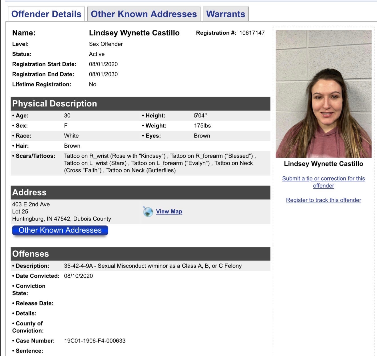 Indiana Sex OffendersLindsey Wynette Castillo | Dubois County | 🚨Sexual Predator Alert 🚨Hoosier MugsApr 02, 2026ShareCharges35-42-4-9(a)/F4:Sexual Misconduct with a Minor Def. has intercourse with or engages in other sexual