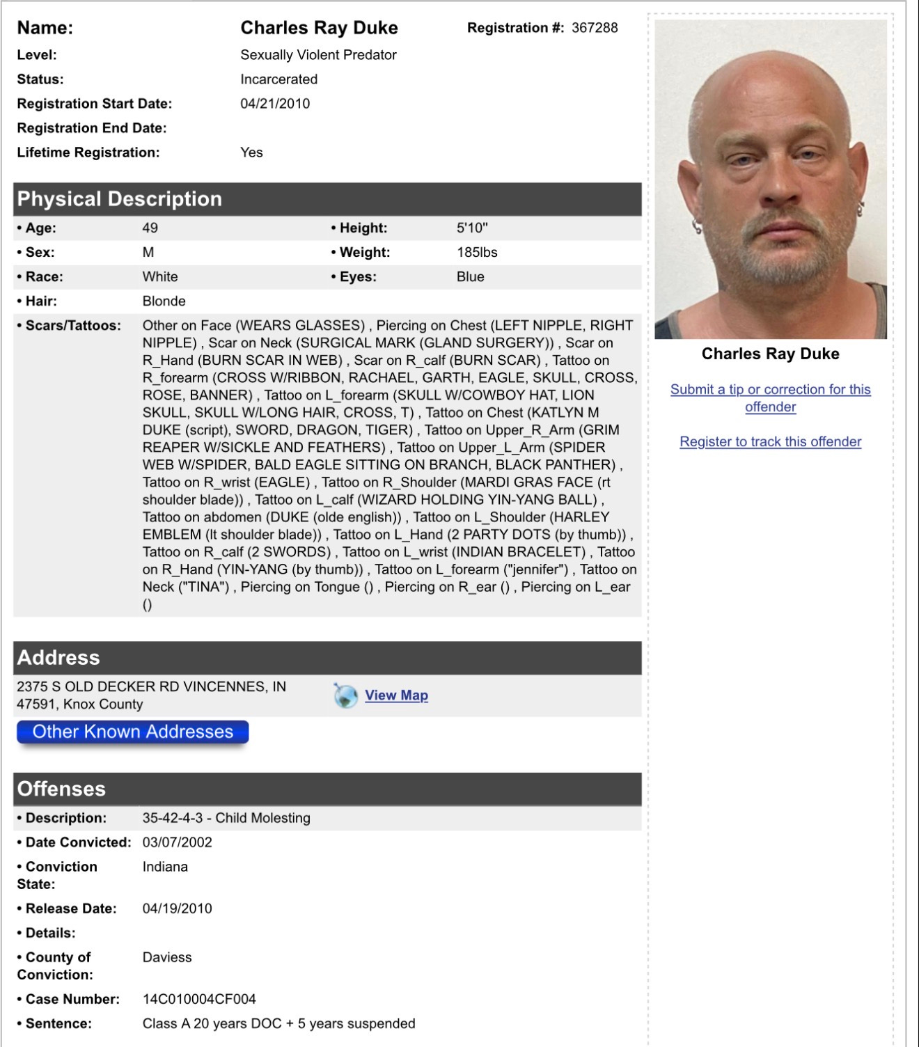 Indiana Sex OffendersCharles Ray Duke | Knox County | ๐จ Sexual Predator Alert ๐จ Hoosier MugsApr 18, 2026ShareCharges:35-42-4-3 - Child Molesting